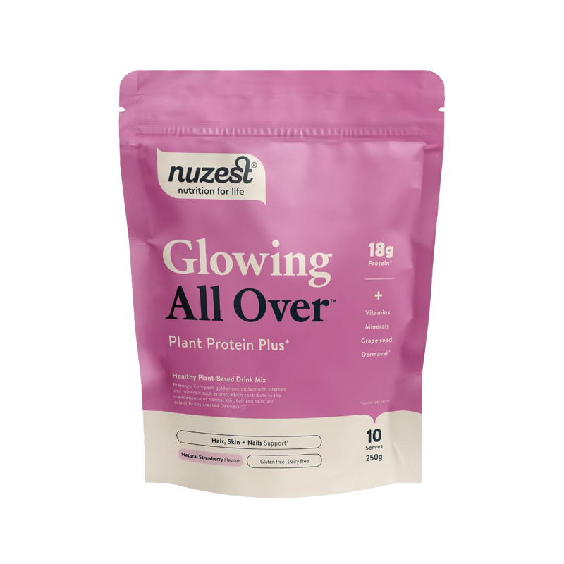 Nuzest Plant Protein Plus+ - Glowing All Over is a premium plant protein supplement designed to enhance your beauty from the inside out. Enriched with a blend of vital nutrients, this product supports the health of your hair, skin, and nails while promoting collagen production for youthful vitality. The delicious natural strawberry flavour makes it a delightful addition to your daily nutrition.