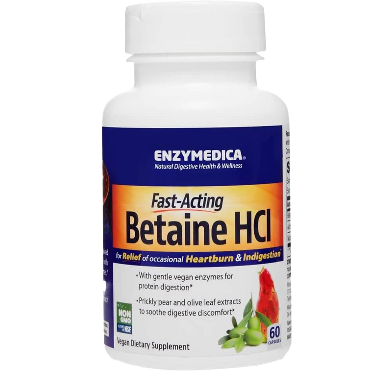 Unlock the power of digestion with Enzymedica Betaine HCI 600mg, a premium nutritional supplement designed to combat the symptoms of low stomach acid. When your body struggles with occasional heartburn, naturally increasing acid levels can be the solution. Betaine HCl works effectively to boost your stomachâs acidity, promoting optimal digestion and nutrient absorption. Paired with gentle protein-digesting enzymes and the soothing properties of MucoSaveâderived from the nourishing Prickly Pear and Olive Leaf extractsâthis formula supports a comfortable digestive experience. Your digestive health is essential, and this supplement aims not just to alleviate discomfort, but to enhance your overall gut vitality.