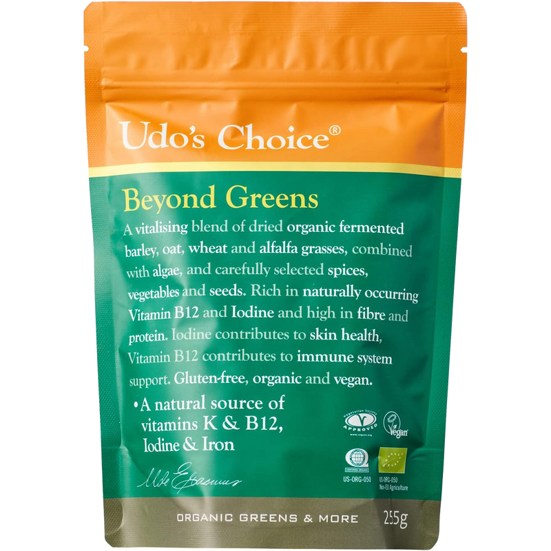 Transform your nutrition with Udo's Choice Beyond Greens, expertly crafted for those seeking a plant-based powerhouse of nutrition. This exceptional vegan super greens powder combines the rich benefits of barley, oats, and wheat, providing an exhaustive array of vitamins and minerals. Each serving serves as a convenient booster for smoothies, juices, or even baking, ensuring you never miss out on your vital greens.