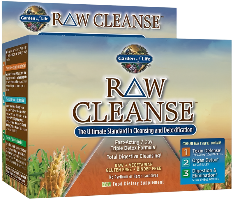 Garden of LifeRaw Cleanse - 1 kitFood supplement in capsule and powder form, containing vitamins, minerals, antioxidant blend, probiotics and fruit extractsNutrition FactsServing Size: 1 Packet (1.5g) / 6 Capsules / 2 Level Scoop (about 21g)Servings Per Container: 7
