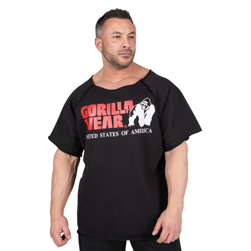 The Gorilla Wear Classic Work Out Top in black is the ultimate homage to classic workout gear. This shirt embodies the spirit of hardcore fitness enthusiasts, designed not just for style but for durability as well. It's printed with the iconic Gorilla Wear logo prominently on the chest, symbolizing strength and resilience.This timeless piece is engineered to perform under pressure, maintaining comfort whether you're lifting weights, running on the treadmill, or simply enjoying a casual day out. The unique blend of fabrics delivers breathability and flexibility, giving you a full range of motion during your workouts. Plus, it’s available in a variety of colors including Red, Grey, Army Green, and Navy, ensuring there’s a fit for every personal style.