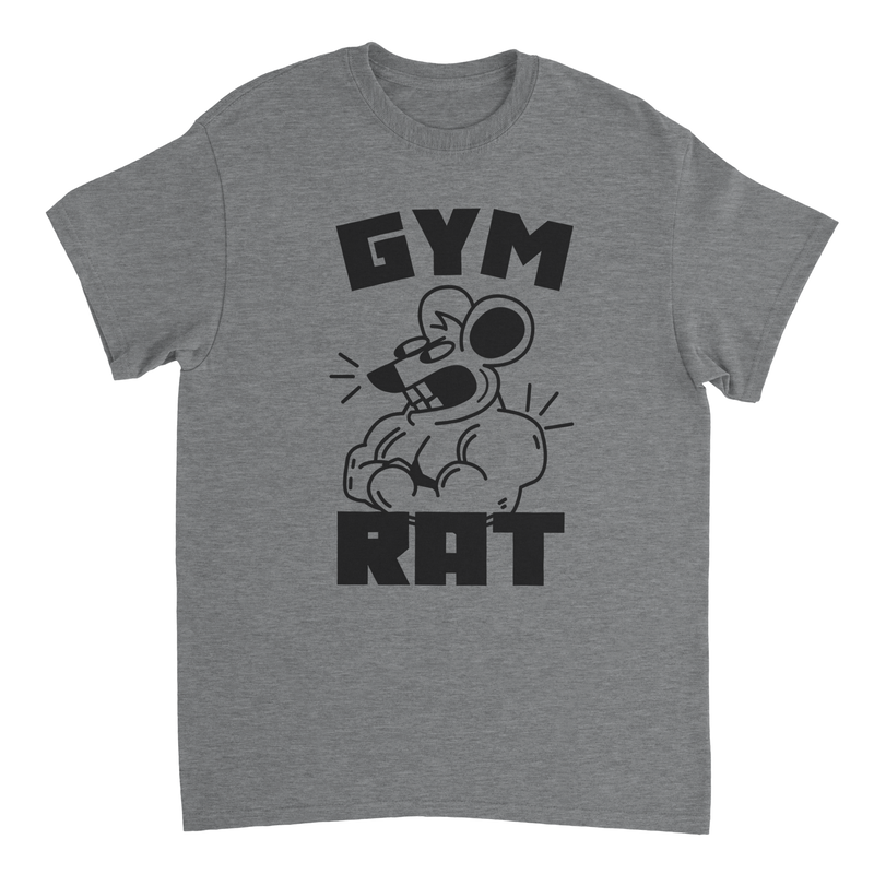 - Design: Black "Gym Rat" text with flexing cartoon rat print