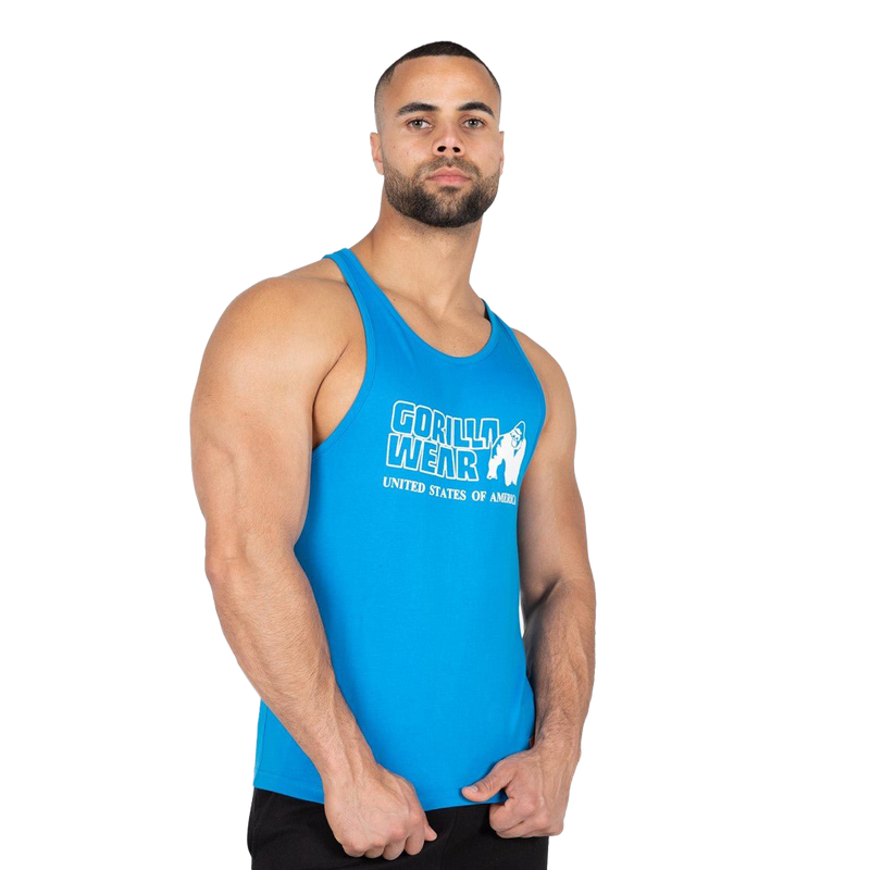 Introducing the Gorilla Wear Classic Tank Top Blueâyour new go-to for comfort and style. This tank top embodies a traditional design that is not only sturdy but also prominently features the GORILLA WEAR logo, allowing you to proudly represent the brand.