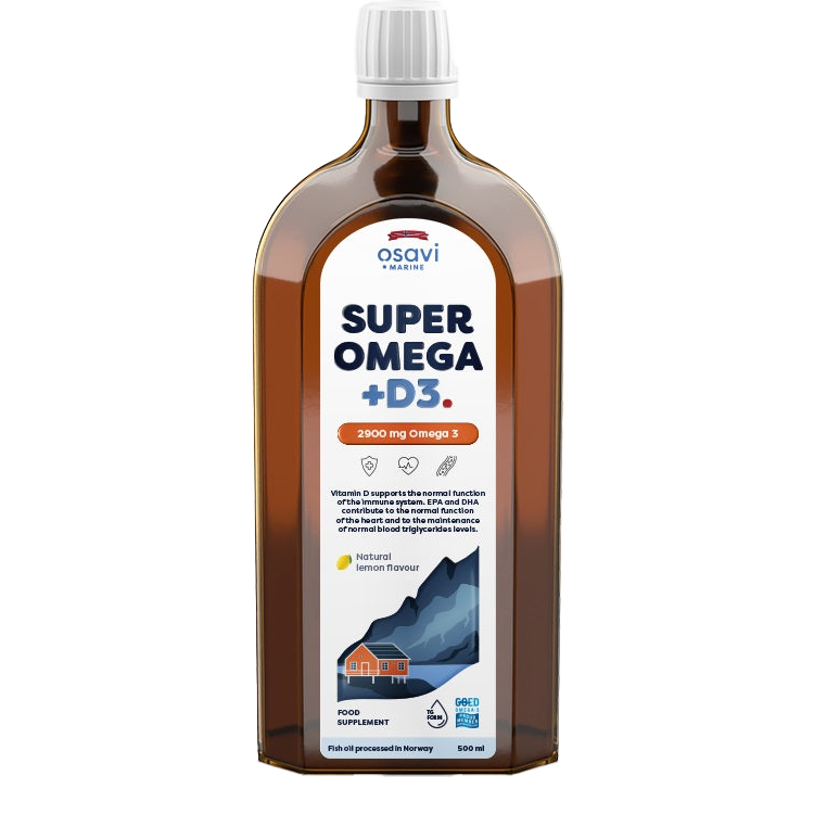 Osavi Super Omega + D3 2900mg Omega 3 (Lemon) 500 ml is your perfect ally for a healthier lifestyle. This premium liquid supplement is derived from wild pelagic fish, predominantly anchovies, and is obtained through sustainable fishing practices. It contains essential unsaturated fatty acids, specifically DHA and EPA, in their naturally highly absorbable form as triglycerides (TG), alongside vitamin D3 in the form of cholecalciferol.