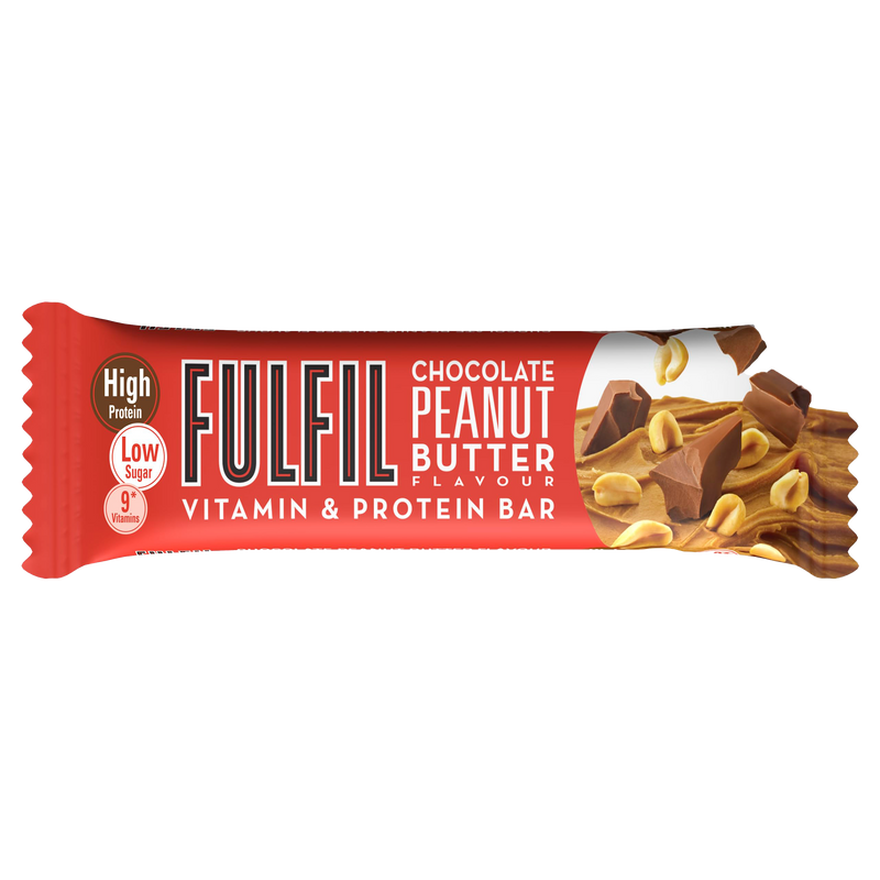 The Fulfil Nutrition Vitamin Protein Bar in Chocolate Peanut Butter is not just another protein barâit's a deliciously nutritious snack that makes healthy eating enjoyable. Each bar features a delectable peanut butter centre, smooth and creamy, encased in a rich milk chocolate coating and topped with a satisfying crunchy layer of peanuts. This isnât just a treat; itâs a powerful snack loaded with protein and vitamins, perfect for athletes and health enthusiasts alike.