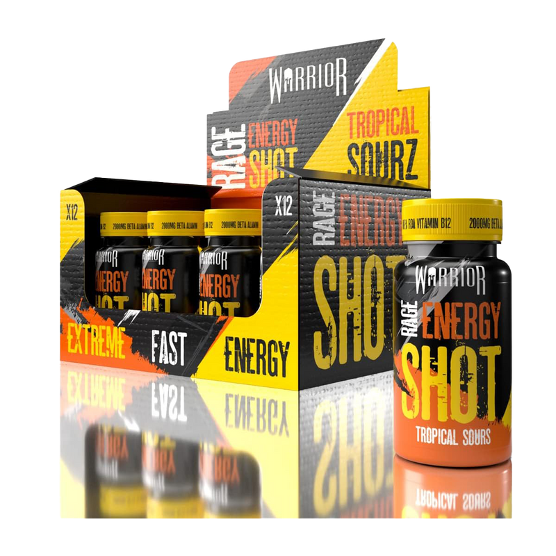 • Warrior RAGE ENERGY SHOT – Pre Workout ShotEnergy Drink – 12 x 60ml – Ready to Drink Supplement – 200mg Caffeine – Natural Flavourings, No Added Sugar – Includes Vitamin B6 & B12 (Tropical Sourz)
